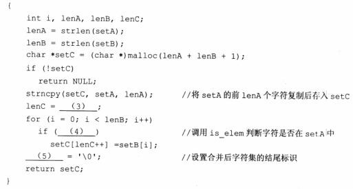 函数char*combine(char*setA,char*setB)的功能是将字符集合A(元素互异,由setA表示)和字符集合B(元素互异,由setB表示)合并,并返回合并后的字符集合。
