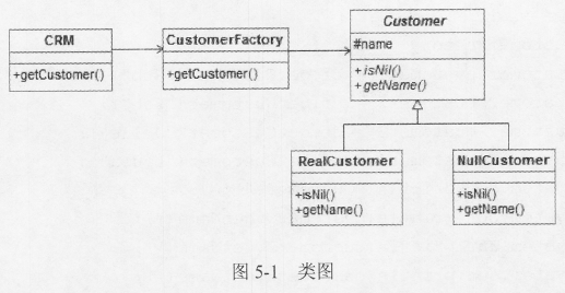 以下Jave代码实现一个简单客户关系管理系统(CRM)中通过工厂(CustomerFactory )对象来创建客户(Customer)对象的功能。客户分为创建成功的客户(RealCustomer)和空客户(NullCustomer)。空客户对象是当不满足特定条件时创建或获取的对象。类间关系如图5-1所示。