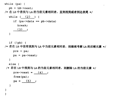 (3) 结束在LB表的一次查找后,若在LB中发现了与LA的当前元素相同者,则删除LA的当前元素,否则保留LA的当前元素。