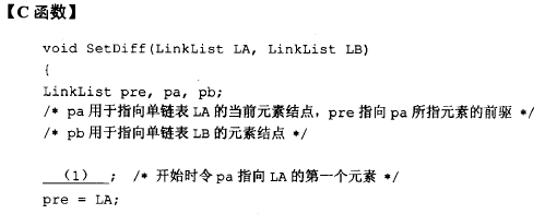 函数SetDiff(LA,LB)的功能是将LA与LB中的共有元素从LA中删除,使得LA中仅保留与LB不同的元素,而LB不变,LA和LB为含头结点的单链表的头指针。