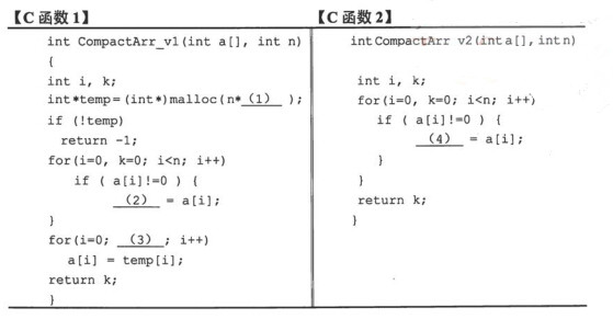 请根据说明中函数CompactArr_vl的处理思路填补空缺(1)〜(3),根据CompactArr_ v2的处理思路填补空缺(4)。