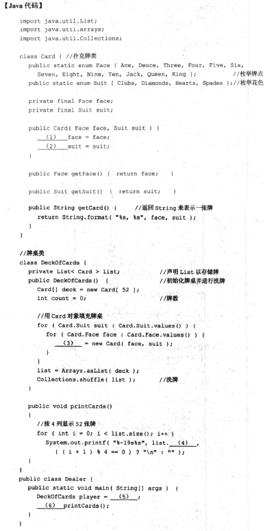 很多依托扑克牌进行的游戏都要先洗牌。下面的Java代码运行时先生成一副扑克牌,洗牌后再按顺序打印每张牌的点数和花色。