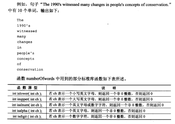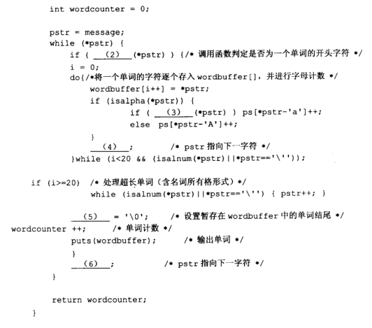 函数numberOfwords (char message[])的功能是计算存储在message字符数组中的一段英文语句中的单词数目,输出每个单词(单词长度超过20时仅输出其前20个字母), 并计算每个英文字母出现的次数(即频数),字母计数时不区分大小写。 假设英文语句中的单词合乎规范(此处不考虑单词的正确性),单词不缩写或省略, 即不会出现类似don't形式的词,单词之后都为空格或标点符号。 函数中判定单词的规则是: (1) 一个英文字母串是单词; (2) 一个数字串是单词; (3) 表示名词所有格的撇号(')与对应的单词看作是一个单词。 除上述规则外,其他情况概不考虑。