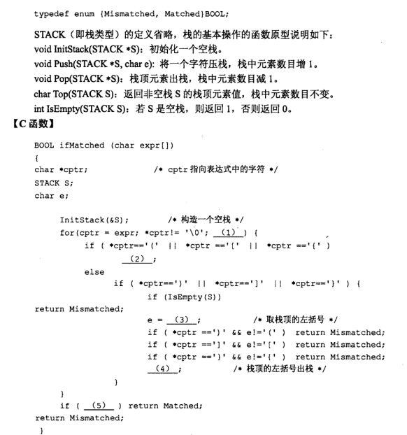 假设一个算术表达式中可以包含以下三种括号:“(”和“)”、“[”和“]”及和 “}”,并且这三种括号可以按照任意的次序嵌套使用。 下面仅考虑表达式中括号的匹配关系,其他问题暂时忽略。例如,表达式 [a-(b-5)]*c[{}]中的括号是完全匹配的,而表达式[a-(b-5]))*c中的括号不是完全匹配的, 因为“(”与“]”不能匹配,而且多了一个“)”,即缺少一个与“)”相匹配的“(”。 函数ifMatched (char expr[])的功能是用栈来判断表达式中的括号是否匹配,表达式 以字符串的形式存储在字符数组expr中。若表达式中的括号完全匹配,则该函数的返回 值为Matched,否则返回值为Mismatched。 该函数的处理思路如下: (1) 设置一个初始为空的栈,从左至右扫描表达式。 (2) 若遇上左括号,则令其入栈;若遇上右括号,则需要与栈顶的左括号进行匹配。 (3) 若所遇到的右括号能与栈顶的左括号配对,则令栈顶的左括号出栈' 然后继续匹配过程;否则返回Mismatched,结束判断过程。 (4) 若表达式扫描结束,同时栈变为空,则说明表达式中的括号能完全匹配,返回 Matched o 函数ifMatched中用到了两种用户自定义数据类型BOOL和STACK,其中,BOOL 类型的定义如下: