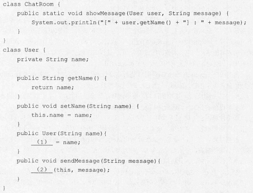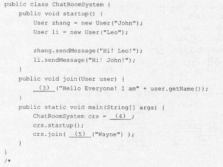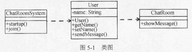 以下Java代码实现一个简单的聊天室系统(ChatRoomSystem),多个用户(User)可以向聊天室( ChatRoom)发送消息,聊天室将消息展示给所有用户。类图如图5-1所示。