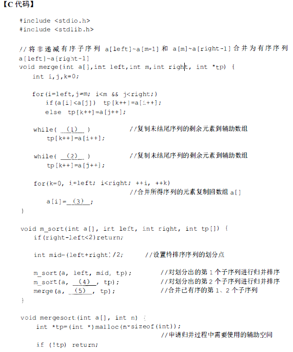 函数merge (inta[].,int left,intmint right, int *tp)对数组下标范围[lefi:,m -1]和[m,right-1 ]所表示的两个有序子序列进行合并。