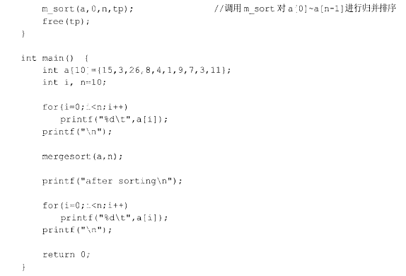 函数mergesort(inta [],i nt left,i nt right, int tp[])对序列进行划分,对以(left+right)/2为界的两个子序列排序后, 调用merge()对两个有序子序列进行合并。