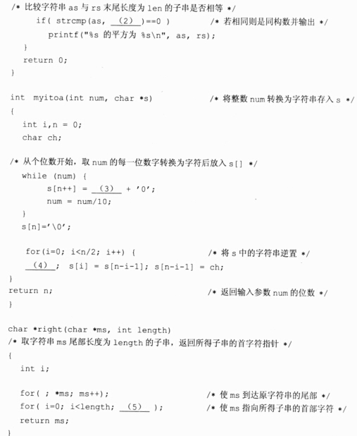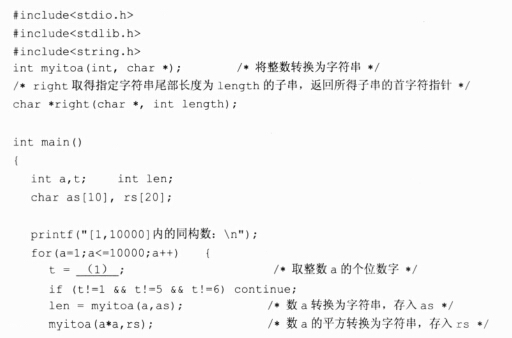 【说明】 正整数n若是其平方数的尾部,则称n为同构数。例如,6是其平方数36的尾部,76是其平方数5776的尾部,6与76都是同构数。下面的程序求解不超过10000的所有同构数。 已知一位的同构数有三个:1,5,6,因此二位同构数的个位数字只可能是1,5,6这三个数字。依此类推,更高位数同构数的个位数字也只可能是1,5,6这三个数字。 下面程序的处理思路是:对不超过10000的每一个整数a,判断其个位数字,若为1、5或6,则将a转换为字符串as,然后对a进行平方运算,并截取其尾部与as长度相等的若干字符形成字符串后与as比较,根据它们相等与否来断定a是否为同构数。 【C程序】