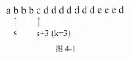 如图4-1所示,在计算连续出现的同一字符个数时,借助字符指针s和计数变量k表示串中的字符,当s所指字符与其后的第k个字符不同时,一个重复字符串的压缩参数即可确定。