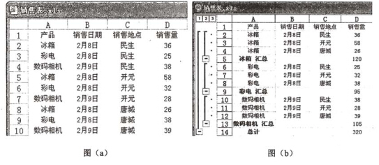 某品牌商品销售情况表如图(a)所示。若想按产品类别分别累计销售量,可使用分类汇总命令。汇总的结果如图(b)所示。