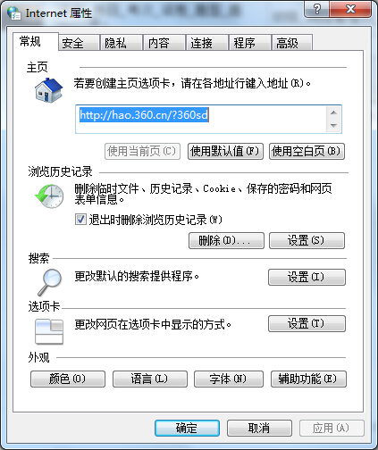 在"常规"选项卡中可以设置主页、Internet临时文件夹、历史记录以及颜色、字体、语言和辅助工具等相关内容。