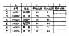 在下图所示的工作表中,若学生的最终成绩等于平时成绩的30%加上考试成绩的70%,那么应在E2单元格中填写(4),并(5)拖动填充柄至E7单元格,则可自动算出这些学生的最终成绩。