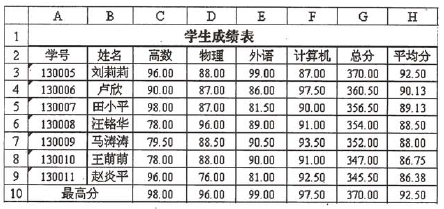学生成绩表如下表所示。若要计算学生各科成绩、总分和平均分各项的最高分,可先在C10单元格中输入(1),并(2)拖动填充柄至H10单元格,则可自动算出这些学生各科成绩、总分和平均分的最高分。