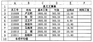 某单位的员工工资表如下图所示。当员工基本工资小于2000元时,绩效工资=基本工资×9%×业绩点;当员工基本工资大于等于2000元时,绩效工资=基本工资×8%×业绩点。若要计算绩效工资,可先在F3单元格中输入(3),并向垂直方向拖动填充柄至F9单元格,则可自动算出每个员工的绩效工资;若要计算各项平均值,则先在C10单元格中输入(4)拖动填充柄至F10单元格。