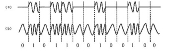 调相(Phase Modulation, PM)即载波的初始相位随着基带数字信号而变化,又称相移键控(PSK)。在调相方式(相移键控)中,数字0和1的载波起始相位不同。例如,可以用θ= 0°代表0,θ=180°代表1,如下图所示,这种方法称为两相调制;如果以θ为0°、90°、180°、270°,分别表示二进制数00、01、10、11,这种方法称为四相调制。每个调制时间间隔包含两个比特的信息,因此,使信息传输速率增加一倍。其特点是实现复杂、抗干扰能力强。