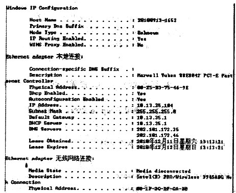 ./all显示所有适配器的完整TCP/P配置信息,其中包括测试的主机名、IP地址、子网掩码、节点类型、是否启用IP路由、网卡的物理地址和默认网关等。