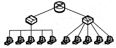 参见下面的网络拓扑结构图,一个路由器、一个集线器和一个交换机共与10台PC相连,下列说法中正确的是()。