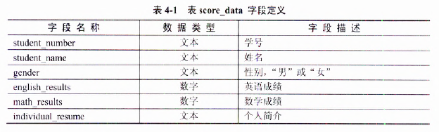 某中学为新入学学生设计了一个学生管理系统,学生需要提交姓名、性别和个人简介等信息,其学号根据学生的提交顺序自动编号。信息提交页面如图4-1所示,提交成功页面如图4-2所示。开学后学校对学生进行了英语和数学的摸底考试,表score_data记录了学生的学号、姓名、性别、个人简介及考试的成绩,其字段定义如表4-1所示。