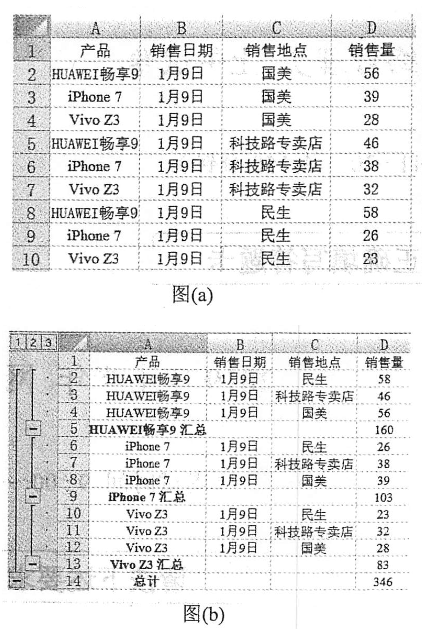 某市场调研公司对品牌商品销售情况进行调查后,得到下图(a)所示的销量统计数据。将图(a)所示的销售量按产品类别分类汇总,得到如图(b)所示的汇总结果。