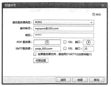 在邮件客户端上添加myname@163.com账号,设置界面如图所示。在①处应填写(68),在②处应填写(69)。
