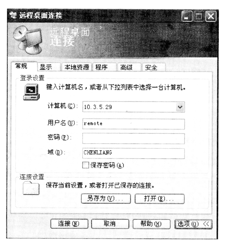 依次选择"开始"→"所有程序"→"附件"→"远程桌面连接"命令,在打开的"远程桌面连接"对话框中,单击"选项"按钮,切换到详细的登录对话框,如下图所示。输入终端服务器的IP地址、用户名、密码,并单击"连接"按钮。出现Windows登录对话框后输入已授权的用户名的密码即可完成连接。