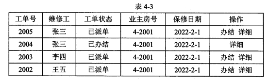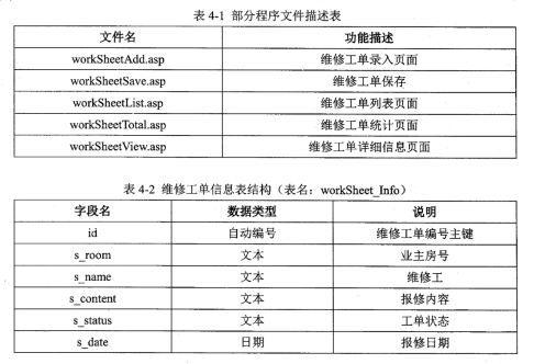 某物业管理系统的工单管理模块可实现业主维修清单录入、派单、工单进度跟踪等功能。该系统开发语言为ASP,部分程序文件功能描述如表4-1所示。所有数据均存储在Access数据库中,数据库文件名为propertyManage.mdb,维修工单信息表数据结构如表4-2所示。