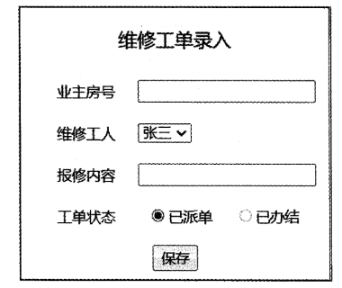 问题:4.1   以下所示代码为维修工单录入的代码片段,图4-1为录入界面截图。“维修工人”默认栏已选中“张三”,也可以点击下拉列表选择其他维修工人;“工单状态”默认为“己派单”,不可选择“己办结”选项。点击“保存”按钮时需要检查业主房号和报修内容,如果为空,则会弹出提示。否则,采用post方法提交form表单到维修工单保存页面;请将(1)~(8)的空缺代码补齐。