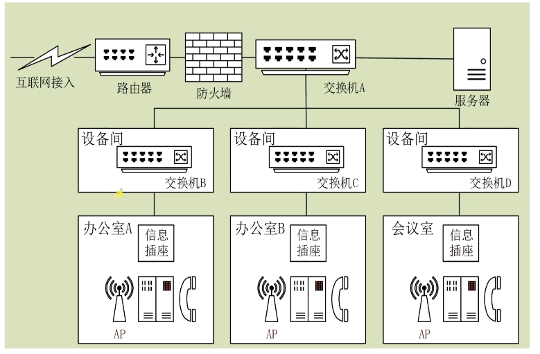 在图1-1中,每个办公室都部署有无线AP,负责移动设备的网络接入,应部署(4)设备实现无线接入统一管理和无缝漫游;在会议室等人员密集区域应部署(5)无线AP