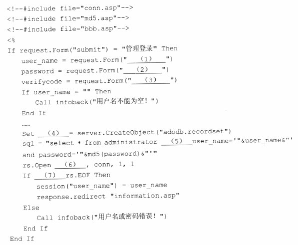 1. 在登录页面login.asp中通过<!--#include file="bbb.asp"-->导入了bbb.asp的代码,以下是bbb.asp的部分代码,请仔细阅读该段代码,将空缺代码补齐。