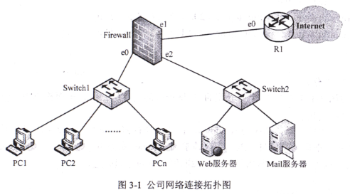 【说明】 某公司网络拓扑结构如图3-1所示。公司采用光纤专线接入Internet,要求公司内部PC全部能够访问Internet,同时还有两台服务器对外分别提供Web和E-mail服务。公司采用PIX防火墙接入互联网。图3-1中两台交换机为普通二层交换机,路由器R1是与该公司互联的第一个ISP路由器。