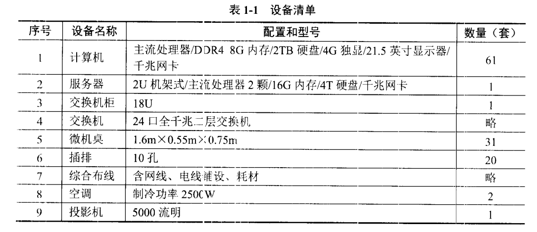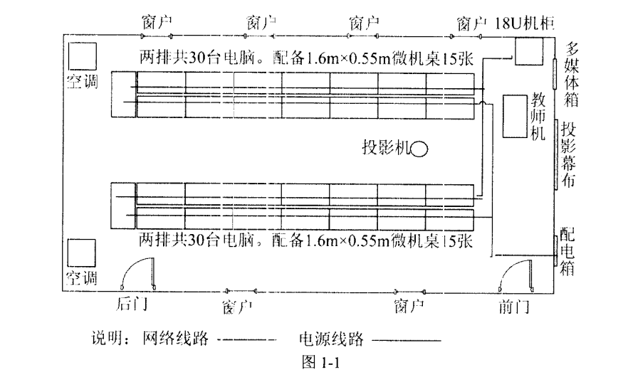 某学校拟建一个计算机机房,机房管理员设计了如图1-1所示的机房布局示意图,表1-1是设备清单。