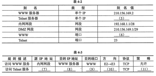 完成防火墙的别名表(表4-2)和E2端口的过滤规则表(表4-3),使内网PC能正常访问WWW服务和Telnet服务。