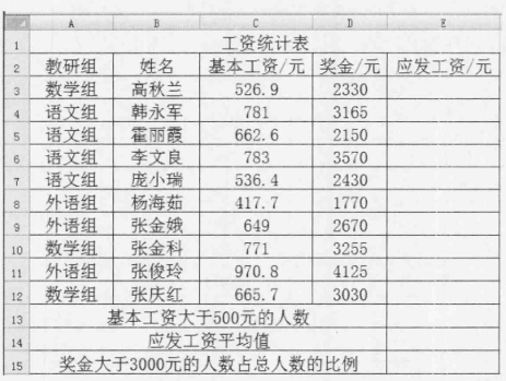 要求: 1. 表格要有可视的边框,并将文字设置为宋体、16磅、居中。 2. 用SUM函数计算应发工资,计算结果保留两位小数,并将计算结果填入对应单元格中。 3. 用COUNTIF函数统计基本工资大于500元人数,将计算结果填入对应单元格中。 4. 用AVERAGE函数计算应发工资平均值,计算结果保留两位小数,并将计算结果填入对应单元格中。 5. 用COUNTIF和COUNT函数计算奖金大于3000元的人数在总人数中的比例,计算结果保留两位小数,并将计算结果填入对应单元格中。