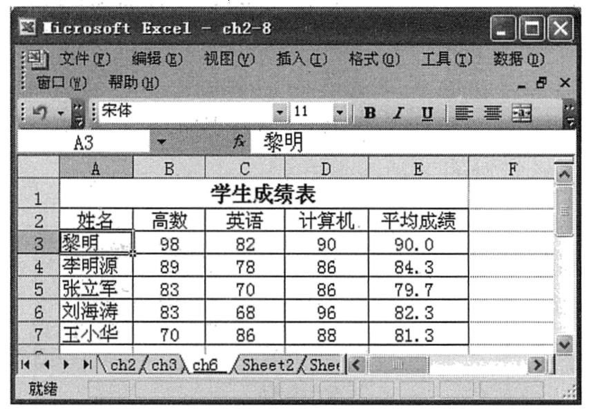 数据排序是指按一定规则对数据进行排序。Excel 2003提供了多种数据排列方法,可按升序和降序排列,也可由用户自定义排序。如果按照单独一列的数据进行排序,可直接使用“常用”工具栏中的升序按钮和降序按钮进行快速排序;如果要对多列(最多3列)数据进行排序,则需选择“数据”→“排序”命令。以下图(a)所示的学生成绩表为例,其操作步骤如下。