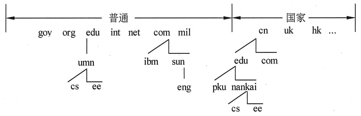 顶级域的管理权被分派给指定的管理机构,各管理机构对其管理的域继续进行划分,即划分成二级域并将二级域名的管理权授予其下属的管理机构,如此层层细分,就形成了层次状的域名结构。下图显示了因特网的域名结构。