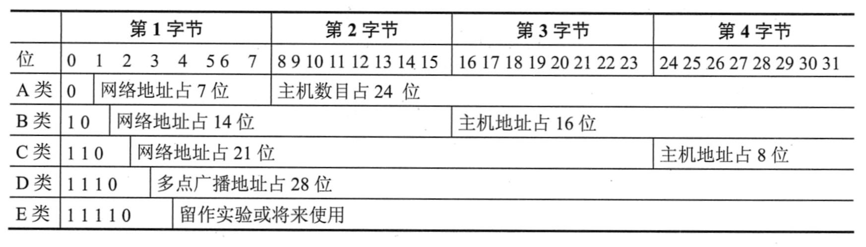TCP/IP协议规定,根据网络规模的大小将IP地址分为5类:A类(ClassA)、B类(Class B)、C类(Class C)、D类(Class D)和E类(Class E)。其中A、B和C类地址是基本的Internet地址,D类和E类为次类地址,D类地址被称为组播(multicast)地址,而E类地址尚未使用,以保留给将来的特殊用途。IP地址的详细结构如下表所示。