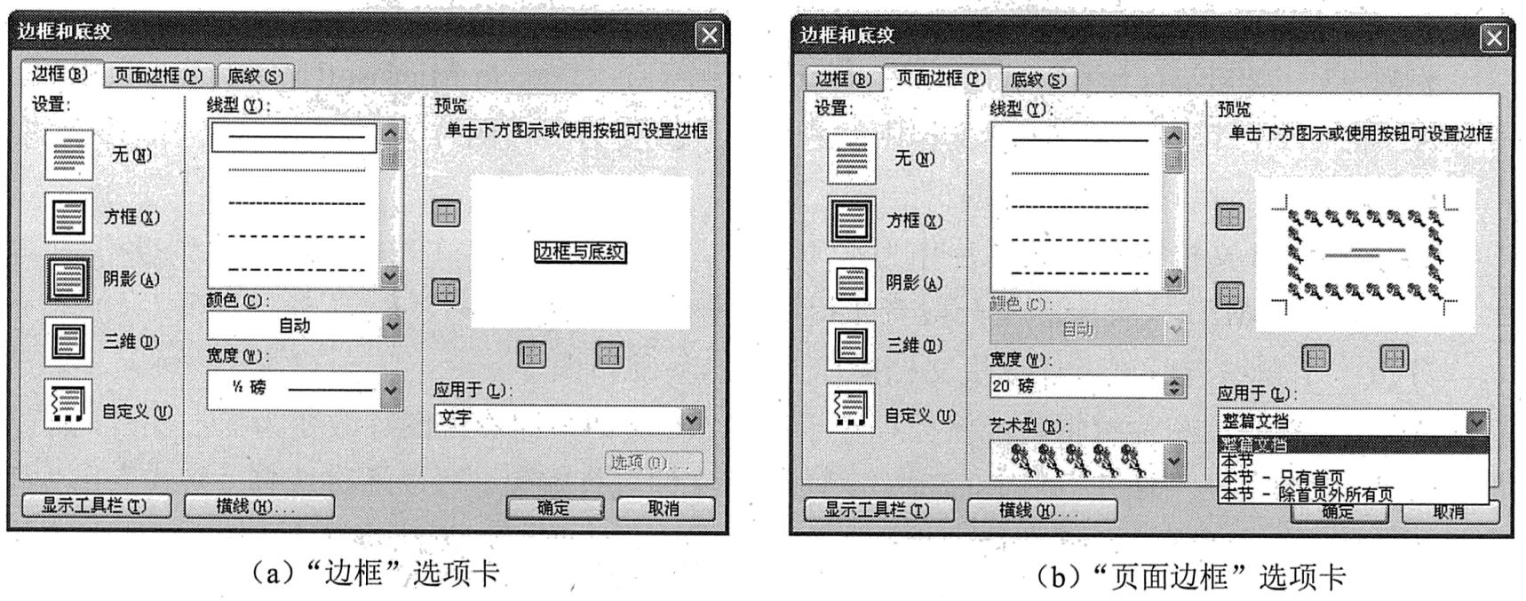 (1)将光标放在页面的任一位置处,选择“格式”→“边框和底纹”命令,在弹出的“边框和底纹”对话框中选择“页面边框”选项卡。如上图(b)所示。