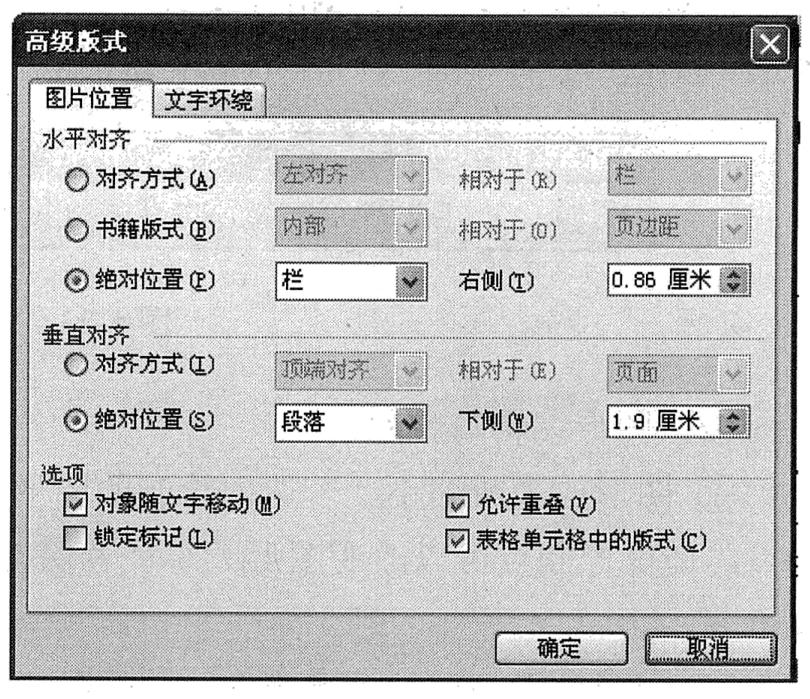 对于除了嵌入型的其他4种版式,都可以利用“高级版式”对话框对图片位置、对齐方式和文字环绕进行详细而准确的设置。单击“版式”选项卡中的“高级”按钮,就会弹出“高级版式”对话框,如下图所示。