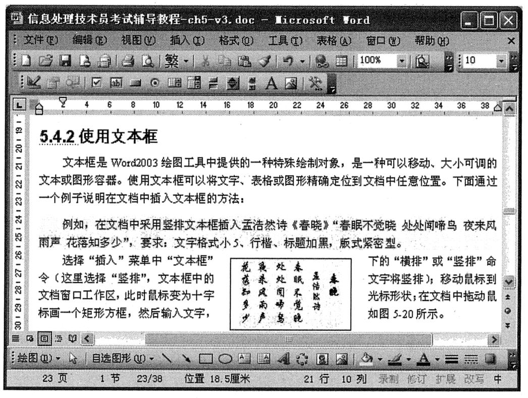 文本框是Word 2003绘图工具中提供的一种特殊绘制对象,是一种可以移动、大小可调的文本或图形容器。使用文本框可以将文字、表格或图形精确定位到文档中任意位置。下面通过一个例子说明在文档中插入文本框的方法。