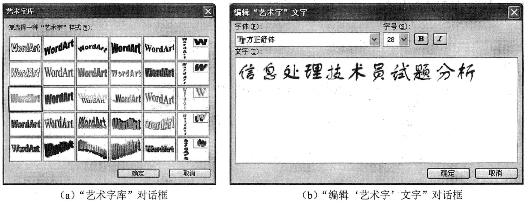 (1)执行“插入”→“图片”→“艺术字”命令,打开“艺术字库”对话框,如下图(a)所示,选择一种艺术字型,单击“确定”按钮。