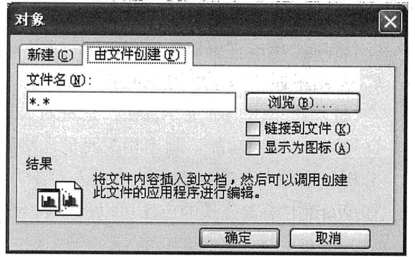 (1)建立对象链接操作方法:将光标移到需要插入链接对象的文本区,选择“插入”→“对象”命令,弹出“对象”对话框,选择“由文件创建”选项卡,如下图所示。单击“浏览”按钮,在弹出的“浏览”对话框中选择链接对象(源)文件名后,单击“插入”按钮。在“对象”对话框中选中“链接到文件”复选框,单击“确定”按钮。