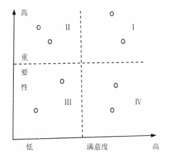 某企业对多项已完成的数据处理任务进行了评估,按其满意度重要性度量值为坐标,标在下图中,用小圆表示)。这些坐标点分别落入I、II、III、IV四个区中。领导认为,位于(70)区中的任务是需要优先改进的。