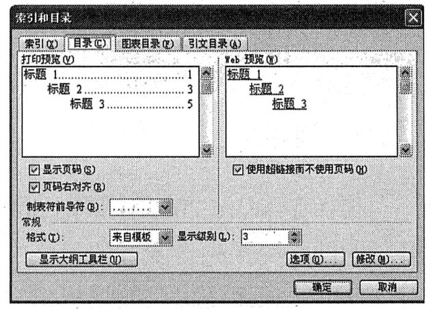 自动生成目录方法:将插入点定位到文档的首部(即目录的插入处),再依次选择“插入”→“引用”→“索引和目录”命令,打开“索引和目录”对话框,如下图所示。然后按要求设置是否显示页码、页码是否右对齐以及制表符前导符的样式。最后单击“确定”按钮,即可自动生成目录。