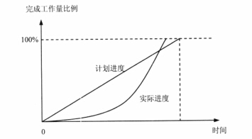 小张承担了某信息处理项目,在完成之日向领导做了汇报,将计划进度与实际进度画出了如下两条曲线: