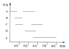 下图是某工程A-E五个作业的进度计划。按照该计划,到5月31日检查时,已完成作业数、已经开始但尚未完成的作业数以及尚未开始的作业数应分别为(68)。