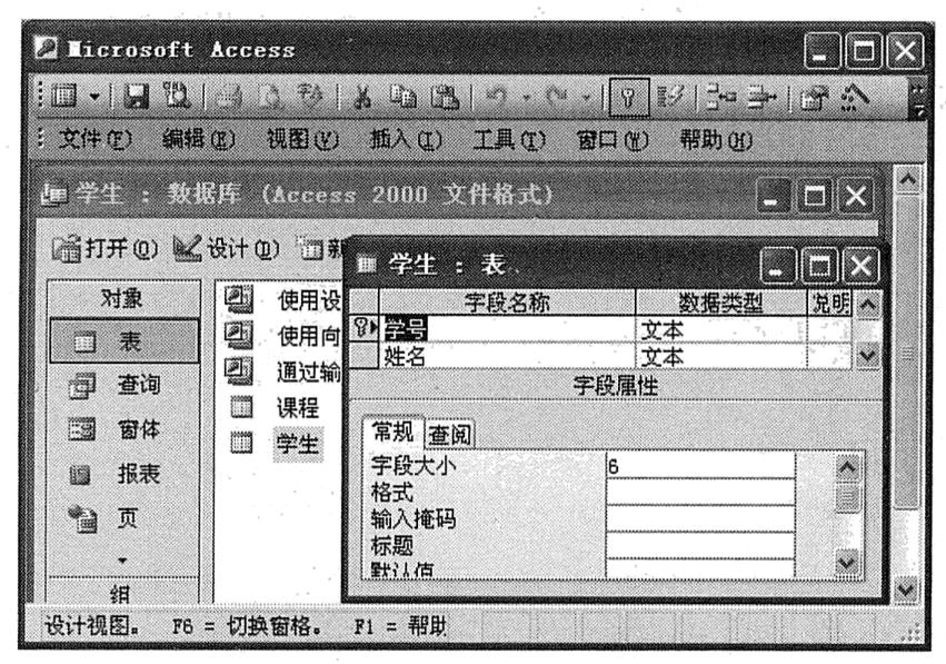 将学生数据库中学生表的“学号”设置成主键的方法(单字段主键设置):打开学生表的“设计”视图,将光标移到待设置为主键的“学号”字段的左边,单击右键,在弹出的快捷菜单中选择“主键”命令(或单击该字段行,再单击功能区中的按钮),将“学号”字段设置为主键字段。此时,“学号”字段前有标识,表示该字段已设置为主键,如下图所示。
