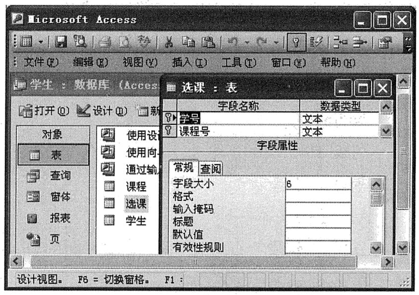 多个字段主键也称为组合主键,即主键由多个字段组成。多字段主键的设置方法:打开表的“设计”视图,将光标移到待设置为主键的多个字段里的某一个,按下Ctrl键的同时再依次单击要设置成主键的字段(如“学号”、“课程号”),再单击鼠标右键,在弹出的快捷菜单中选择“主键”命令,或者单击功能区中的按钮将多个字段设置为主键。例如,选课表中的“学号”、“课程号”设置为主键的结果如下图所示。其中。“学号”、“课程号”前均有标识,表示这两个字段已设置为主键。