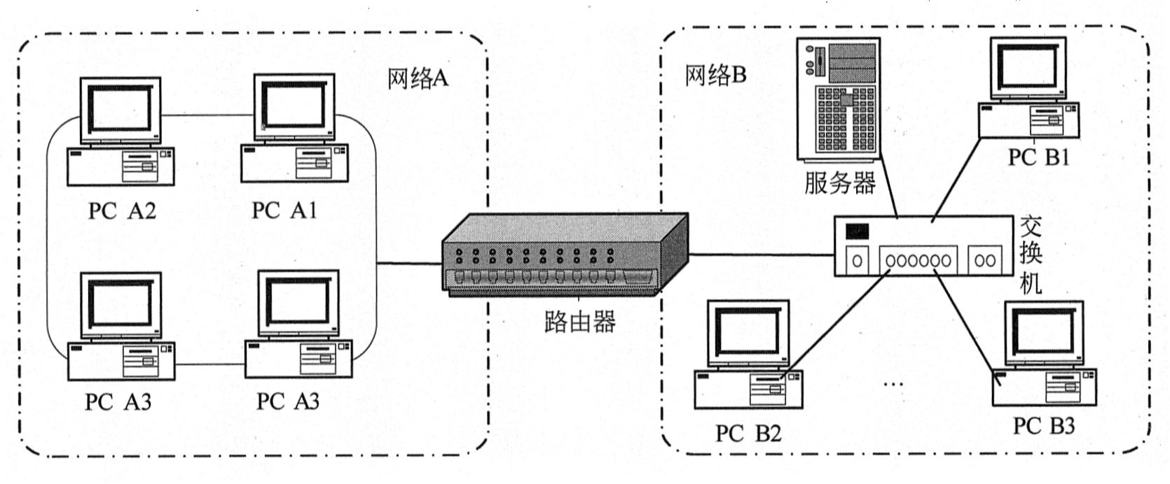 当两个不同类型的网络彼此相连时,必须通过路由器,如下图所示,例如网络A(Token Ring)和网络B(Ethernet)通过路由器连接。