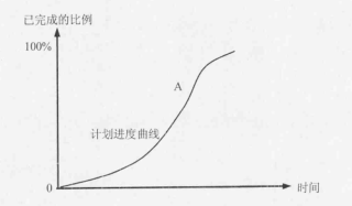 信息处理项目的计划进度曲线如下图(以时间为横轴,已完成任务的比例为纵轴)。设A点是项目中期检查实际到达之处(位于计划进度曲线的左侧),则检查的结论是(67)。