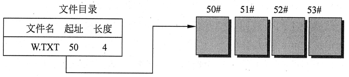 例如,文件W.TXT占用了50、51、52、53号物理块,系统只需将文件的起始块号50和文件的长度放在文件目录中该文件所对应的文件说明中即可,如下图所示。